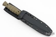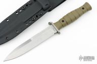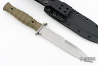 The M320 by Defiant 7 features a stonewashed blade with false top edge and notched thumbrest, .185" blade stock and 1.125" blade depth, hidden tang construction. The handle has a stonewashed titanium guard with green G-10 grip. Comes with a black kydex sheath by Chattanooga Leather Works, and original box. New from maker at the 2024 Blade Show.