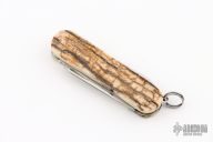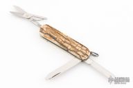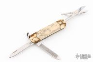 This knife from Victorinox has been upgraded by Dan Farrell, it features a polished spear point blade with nail nick, nail file and scissors. The handle has mammoth ivory covers with scrimshaw of a nude lady, stainless steel backsprings and liners. Excellent condition. Dated 2018.  Dan does some of the best Nude Scrimshaw we have ever seen.