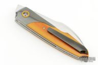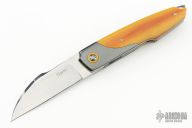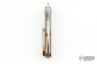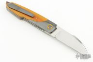 This Front Flipper by Stephane Sagric features a hand rub satin finish wharncliffe blade with swedge and notched thumbrest, front flipper style opening. The handle has Zirconium bolsters, Westinghouse micarta scales with titanium liners, matching zirconium backbar and tip up clip. Rides on bearings, nice detent, lockup and blade seating. Comes with leather case, patch, and coin. New from Maker at the 2024 Blade Show!