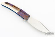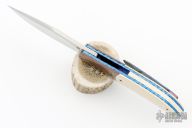 This HB20 linerlock flipper by Herucus Blomerus features a hand rub satin finished blade with polished flats and flipper. The handle has MokuTi bolsters, imitationivory scale, anodized and fileworked titanium liners, imitation ivory backspacer and a tip up mokuti clip. Blade is centered when closed, nice detent and lockup. Very smooth flipping action, rides on IKBS. Comes with a leather case and COA. New from maker at the 2024 Blade Show.