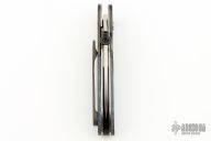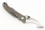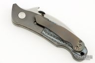 This Elvia by Emerson Knives features a stonewashed hawkbill blade with a black thumbdisc. The handle has zirconium bolsters, grey carbon fiber scales, titanium liners and a bead blast finished zirconium tip up clip. Comes with a Velcro pouch. New from the 2024 Blade Show! Modified by Steve Kyle.