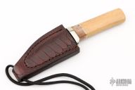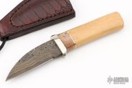 This Neck Knife by Herb Derr features a Birds Eye Damascus blade with .143" blade stock and .895" blade depth, hidden tang construction. The handle is comprised of a nickel silver guard with spalted maple and nickel silver spacers and a stellar sea cow rib bone grip. Includes a brown leather sheath with ostrich leg skin overlay and magnet inside the sheath to hold the knife securely in place. Comes with COA. New from maker at the 2024 Blade show.