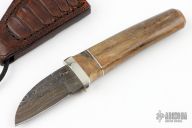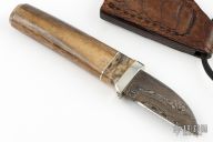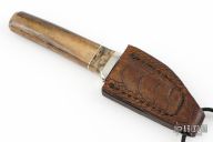 This Neck Knife by Herb Derr features a Birds Eye Damascus blade with .145" blade stock and .867" blade depth, hidden tang construction. The handle is comprised of a nickel silver guard with buckeye burl and nickel silver spacers and a giraffe leg bone grip. Includes a brown leather sheath with ostrich leg skin overlay and magnet inside the sheath to hold the knife securely in place. Comes with COA. New from maker at the 2024 Blade show.