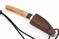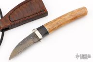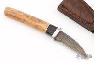 This Neck Knife by Herb Derr features a Birds Eye Damascus blade with .147" blade stock and .728" blade depth, hidden tang construction. The handle is comprised of a nickel silver guard with buckeye burl and nickel silver spacers and a oosic grip. Includes a brown leather sheath with ostrich leg skin overlay and magnet inside the sheath to hold the knife securely in place. Comes with COA. New from maker at the 2024 Blade show.