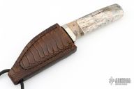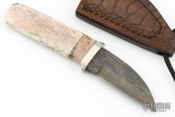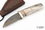 This Neck Knife by Herb Derr features a Birds Eye Damascus blade with .144" blade stock and .961" blade depth, hidden tang construction. The handle is comprised of a nickel silver guard with spalted maple and nickel silver spacers and a giraffe bone grip. Includes a brown leather sheath with ostrich leg skin overlay and magnet inside the sheath to hold the knife securely in place. Comes with COA. New from maker at the 2024 Blade show.
