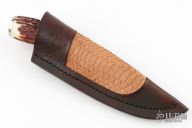 This Hunter by Herb Derr features a Birds Eye Damascus blade with fileworked spine, .162" blade stock and 1.041" blade depth, hidden tang construction. The handle is comprised of a nickel silver guard with maple burl and nickel silver spacers and a stag grip, nickel silver butt. Includes a brown leather sheath with python skin inlay. Comes with COA. New from maker at the 2024 Blade show.