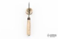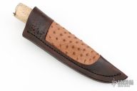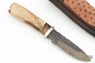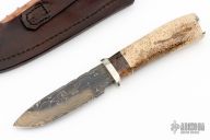 This Hunter by Herb Derr features a Birds Eye Damascus blade with fileworked spine, .156" blade stock and 1.133" blade depth, hidden tang construction. The handle is comprised of a nickel silver guard with Buckeye Burl and nickel silver spacers and a walrus jaw bone grip, nickel silver butt. Includes a brown leather sheath with ostrich skin inlay. Comes with COA. New from maker at the 2024 Blade show.