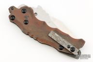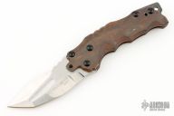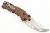 This Mitrul by TASKnives features a satin finished, multi-ground blade with a notched thumbrest, and false top edge. The handle has distressed titanium scales. Knife does not lock, it is a slipjoint. Has lanyard bail. Comes with maker's bandanna and 3D printed case/display stand. New from maker!