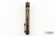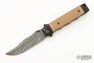 This MAC V SOG folder by Allen Elishewitz features a stainless Damascus blade with notched thumbrest and thumbdisc. The handle has G-10 scales, textured and anodized titanium liners, black G-10 backspacer, tip up anodized titanium clip. Nice detent, lockup and blade seating. Comes with original leather case and COA. New from maker at the 2024 Blade Show.