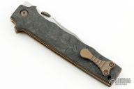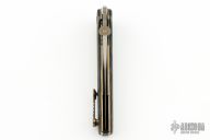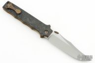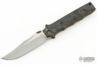 This MAC V SOG folder by Allen Elishewitz features a two-tone blade with notched thumbrest and thumbdisc. The handle has carbon fiber scales, textured and anodized titanium liners, black G-10 backspacer, tip up anodized titanium clip. Nice detent, lockup and blade seating. Comes with original leather case and COA. New from maker at the 2024 Blade Show.