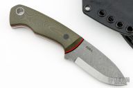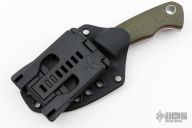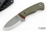 This PSK (Personal Survival Knife) by Tom Krein features a two-tone scandi ground blade with .14" blade stock and 1.151" blade depth. The handle is comprised of green canvas micarta scales with micarta pin and lanyard tube over red/black liners and full tang construction. Includes Kydex sheath with TekLok. New from maker!
