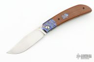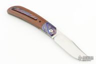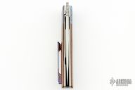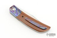 This Foxy Front Flipper by Maxime Belzunce features a hand rub satin finished blade with notched thumbrest and front flipper. The handle has dovetailed black timascus bolsters, brown canvas micarta scales with a black timascus escutcheon, bead blasted titanium liners, black timascus backspacer and tip up clip with hidden screws. Nice detent, lockup and blade seating. Comes with a felt case. New from maker at the 2024 Blade Show.