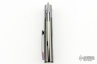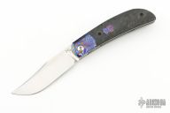 This Foxy Front Flipper by Maxime Belzunce features a hand rub satin finished blade with notched thumbrest and front flipper. The handle has dovetailed timascus bolsters, marble carbon fiber scales with a timascus escutcheon, bead blasted titanium liners, timascus backspacer and tip up clip with hidden screws. Nice detent, lockup and blade seating. Comes with a felt case. New from maker at the 2024 Blade Show.