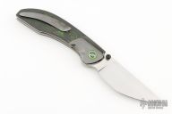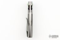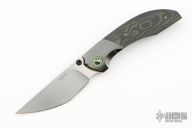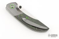 This liner lock by Stephane Sagric features a hand rub satin finished blade with dual thumbstuds and notched thumbrest. The handle has dovetailed zirconium bolsters, camo carbon scales, satin titanium liners, camo carbon backspacer, and tip up zirconium clip. Rides on bearings, nice detent, lockup and blade seating. Comes with leather case, patch, and coin. New from Maker at the 2024 Blade Show.