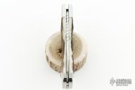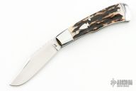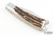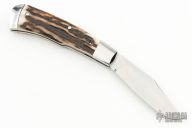 This "Hill Lock" Trapper by Tobin Hill features a hand rub satin finished clip point blade with a nail nick and fileworked spine.  The handle features stainless steel bolsters, stag covers with stainless steel escutcheon, stainless steel liners, and a fileworked stainless steel backspacer connected to the rear bolsters forming the "Hill Lock". Once open, press down on the rear bolsters to release the lock and close the knife. Includes a padded zippered case.  Brand New from maker at the 2024 Blade Show.