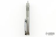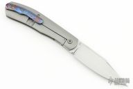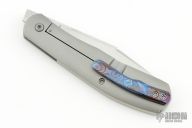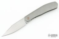 This Prototype "Sina" Front Flipper framelock by Stephane Espi features a hand rub satin finished blade with notched front flipper. The handle has a bead blasted titanium frame with copper pivot collars, satin titanium backspacer, tip up black timascus clip. Nice detent, lockup and blade seating, rides on bearings. Comes with a felt case and COA. New from maker at the 2024 Blade Show.