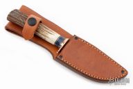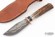 This Clip Point Hunter by Rocco Handmade features a Copper San-Mai blade with a false top edge, .124" blade thickness and 1.252" blade depth, hidden tang construction. The handle has a copper guard, stag grip, blue/black/copper spacer pattern. Great look and feel. Comes with brown leather sheath. New from maker at the 2024 Blade Show.