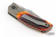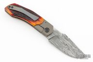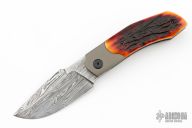 This Linerlock Front Flipper by Richard Soler features a Stainless Damascus blade with notched thumbrest and front flipper. The handle has anodized titanium bolsters with integral liners, stag scales, carbon fiber and orange G-10 backspacer with lanyard pin, tip up titanium clip. Comes with a zippered case and COA. New from maker at the 2024 Blade Show.