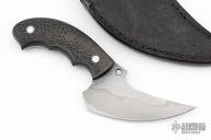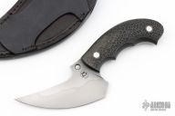 This Skinner by Mariano Yannoni features an upswept blade with nice hamon, notched thumbramp, false top edge, .132" blade stock and 1.585" blade depth, full tang construction. The handle has carved and pinned carbon fiber scales. Comes with a brown leather sheath, COA and leather case. New from maker at the 2024 Blade Show.