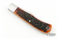 This Bose Pattern Back Pocket by Charles Vestal features a hand rub satin finished blade with nail nick. The handle has 416 stainless steel bolsters with integral liners, amber jigged bone covers, CPM-154 spring. Has half-stop, flush in all positions. Comes with a zippered case and COA. New from maker at the 2024 Blade Show.
