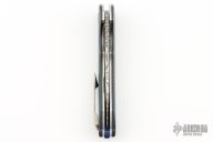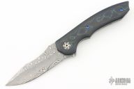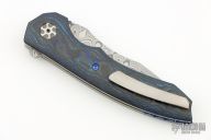 This Scion Flipper by Peter Carey features a Baldur Damasteel blade with swedge, notched thumb ramp and flipper. The handle has camo carbon scales, orange peel titanium liners, black/blue carbon fiber dragon spine backspacer. Matching orange peel titanium tip up clip with hidden screws. Great blade seating, detent and lock up. Includes padded and zippered case with makers card dated 1-6-24. Excellent condition.