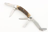 This 5-Blade Sowbelly by Tobin Hill features hand rub satin finished blades with nail nicks. The handle has threaded stainless steel bolsters with integral liners, stag covers, stainless steel escutcheon, springs and liners, has half-stops, flush in all positions. Comes with a zippered case. New from maker at the 2024 Blade Show.