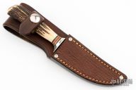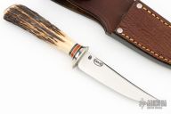 This Trout and Deer by Jim Behring features a satin finished hollow ground blade with 0.101" blade stock and .746" blade depth, hidden tang construction. The handle has a nickel silver guard, 120 year old stag, with black/yellow/red spacers and matching nickel silver buttcap. Comes with a brown leather sheath with shark panel. New from maker!