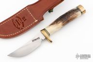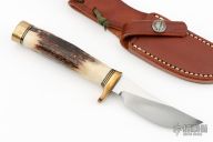 This Randall Made Model 21 has a satin finished upswept blade with notched thumbrest, .135" blade stock and a blade depth of .815", hidden tang construction. The handle has a brass guard with a stag grip, black/brass spacers and brass butt cap. Knife comes with a brown leather sheath. Has some patina, excellent condition otherwise.