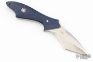 This Tanto by Jerry Hossom features nicely shaped blue Richlite scales with white/red liners and mosaic and brass pins. Hand rubbed satin finished blade with thumb ramp and sharpened top edge, .153" blade stock and 1.135" blade depth, full tapered tang construction. Fits nicely in hand. Comes with zipper case. New from maker at the 2024 Blade Show!