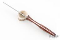 This Dark Heart by Jerry Hossom features nicely shaped wood scales with a mosaic pin. Hand rubbed satin finished blade with thumb ramp, .153" blade stock and 1.092" blade depth, full tapered tang construction. Fits nicely in hand. Comes with a zipper case. New from maker at the 2024 Blade Show!