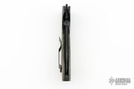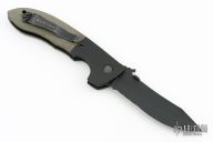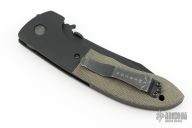 This Emerson PoBoy CQC-8 by Andrew Charlet features a black partially serrated blade with thumb disc, wave feature, and notched thumbrest. The handle has black dovetailed titanium bolsters, green canvas micarta scales, black titanium liners, black G-10 backspacer, black tip up stainless steel clip. Nice detent, lockup and blade seating. Comes with original black G-10 scales. Excellent condition. Dated 2008 and #1376