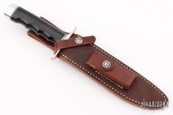 This Model 1-7 from Randall Made Knives features a satin finished clip point blade with sharpened top edge, .216" blade stock and 1.284" blade depth, hidden tang construction. The handle is comprised of a nickel silver guard, black/duralumin spacers, finger groove black linen micarta grip and duralumin pommel. Comes with brown leather sheath. New condition.