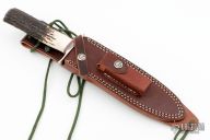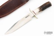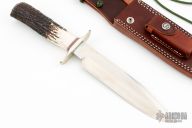 This Model 14 CDT by Randall Made Knives features a clip point satin finished blade with a sharpened top edge, .235" blade stock. 1.330" blade depth. The handle has a nickel silver guard, stag grip, red/white/blue spacers, nickel silver butt plate. Cut Down hidden tang. This knife was designed to meet the demand for an almost indestructible all-purpose knife, though it is especially suited for combat and survival purposes. Comes with a brown leather sheath and original paper wrapping. New from maker.