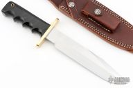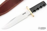 This Model 14 by Randall Made Knives features a satin finished blade with sharpened top edge, .211" blade stock. 1.422" blade depth, full tang construction. The handle has a brass guard, black linen micarta handle with a lanyard hole at the butt. This knife was designed to meet the demand for an almost indestructible all-purpose knife, though it is especially suited for combat and survival purposes. Comes with brown leather sheath and original paper wrapping. New from maker.