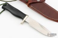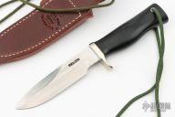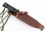 This Combat Companion by Randall Made Knives features a satin finished blade with notched thumbrest and sharpened top edge, .168" blade stock and 1.154" blade depth, full tang construction. The handle has a nickel silver guard, black linen micarta grip, and a lanyard hole. The Combat Companion is one of Randall's non-catalog knives. Includes a brown leather sheath and original paper wrapping. New from maker.