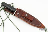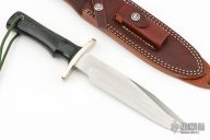 This Model 14 by Randall Made Knives features a satin finished blade with sharpened top edge, .233" blade stock. 1.365" blade depth, full tang construction. The handle has a forward curved nickel silver guard, black linen micarta handle with a lanyard hole at the butt. This knife was designed to meet the demand for an almost indestructible all-purpose knife, though it is especially suited for combat and survival purposes. Comes with brown leather sheath and original paper wrapping. New from maker.
