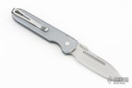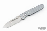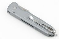 This Invictus by Pro-Tech is a Prometheus Design Werx design, it features a stonewashed blade with fullers and notched thumbrest.  The handle has a grey aluminum frame with a stainless steel tip up clip, lanyard hole at the butt. Push button with mother of pearl inlay and a safety. Comes with original box and papers. New from maker at the 2024 Blade Show.