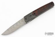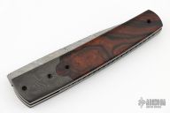 This linerlock Front Flipper by CavadonArt features a Damascus blade with fileworked spine and notched thumbrest/front flipper. The handle has camo carbon bolsters, desert ironwood burl scales, titanium liners and a fileworked zirconium backspacer. Nice detent, lockup and blade seating. Comes with a zippered case. New from maker at the 2024 Blade Show. Comes with COA and branded tool kit.