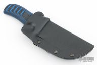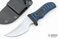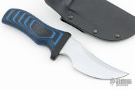 This Baby War Rhino by Mad Dog Knives features an upswept blade with sharpened top edge, .249" stock, and 1.493" blade depth, hidden tang construction.  Hard chrome blade finish. The handle is designed to be ergonomic and has the ability to withstand tremendous punishment with little or no damage. It is hard and tough enough to be used as an impact tool. Blue and black composite handle -- compression bonded to the hidden full tang and incredibly ergonomic. The knife comes with the standard highride belt sheath New from maker.  The Baby Rhino was originally designed for Mad Dog's 2008 African Safari, small improvements have been made.  New from Maker!