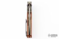 This RAINE Flipper by Kirby Lambert features a Damasteel blade with notched thumbrest and flipper. The handle has zirconium bolsters with copper pivot collars, micarta scales, textured titanium liners, micarta backspacer, Zirconium tip up clip. Has some light scratches, otherwise excellent condition.