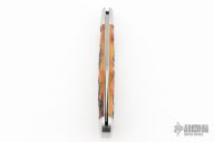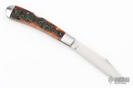 This Lockback by Jim Dunlap features a hand rub satin finished blade with nail nick. The handle has stainless steel bolsters, amber jigged bone scales with stainless steel escutcheon, stainless steel liners and spring. Comes with an leather slip sheath with red ostrich skin overlay by Robertson Leather. New from maker at the 2024 Blade Show.