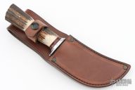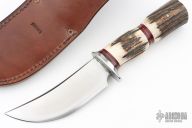This Skinner by Mike Malosh features a satin finished convex ground blade with .207" blade stock and 1.389" blade depth, hidden tang construction. The handle has a stainless steel guard, stag grip with red G-10 and stainless steel spacers, stag grip. Includes a brown leather sheath. New from maker at the 2024 Blade Show.