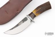 This Skinner by Mike Malosh features a satin finished hollow ground blade with forged finished flats, .230" blade stock and 1.443" blade depth, hidden tang construction. The handle has a stainless steel guard, black/red/stainless steel spacers, stag grip. Includes a brown leather sheath. New from maker at the 2024 Blade Show.