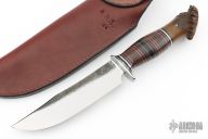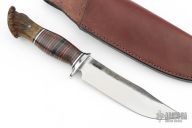 This Trail Knife by Mike Malosh features a satin finished hollow ground blade with forged finished flats, .192" blade stock and 1.329" blade depth, hidden tang construction. The handle has a stainless steel guard, black/red/stainless steel spacers, crown stag grip. Includes a brown leather sheath. New from maker at the 2024 Blade Show.