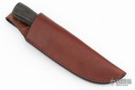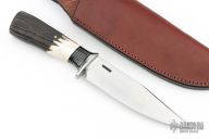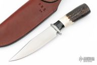 This Trail Knife by Mike Malosh features a satin finished convex ground blade with .175" blade stock and 1.335" blade depth, hidden tang construction. The handle has a stainless steel guard, black/stainless spacers, stag grip. Includes a brown leather sheath. New from maker at the 2024 Blade Show.