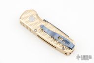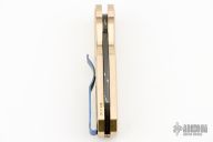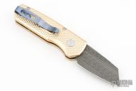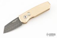 The Runt 5 by Pro-Tech Knives features a Damascus reverse tanto style blade. The handle features a textured aluminum bronze scales with a blue deep carry tip up titanium pocket clip. Comes with original box and papers. #68/80. New from Maker!