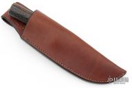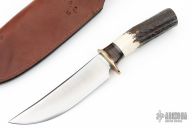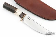 This Trail Knife by Mike Malosh features a satin finished convex ground blade with .192" blade stock and 1.394" blade depth, hidden tang construction. The handle has a copper guard, black/red/aluminum/brass spacers, stag grip. Includes a brown leather sheath. New from maker at the 2024 Blade Show.