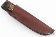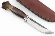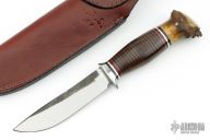 This Hunter by Mike Malosh features a satin finished hollow ground blade with forge finished flats, .157" blade stock and .940" blade depth, hidden tang construction. The handle has a stainless steel guard, black/red/aluminum spacers, stag grip. Includes a brown leather sheath. New from maker at the 2024 Blade Show.