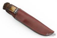 This Hunter by Mike Malosh features a satin finished convex ground blade with .175" blade stock and 1.214" blade depth, hidden tang construction. The handle has a copper guard, black/red/aluminum/brass spacers, stag grip. Includes a brown leather sheath. New from maker at the 2024 Blade Show.