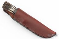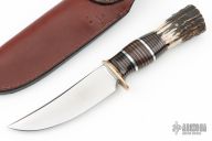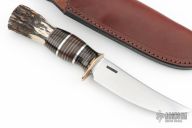 This Hunter by Mike Malosh features a satin finished convex ground blade with .185" blade stock and 1.178" blade depth, hidden tang construction. The handle has a copper guard, black/red/aluminum/brass spacers, stag grip. Includes a brown leather sheath. New from maker at the 2024 Blade Show.